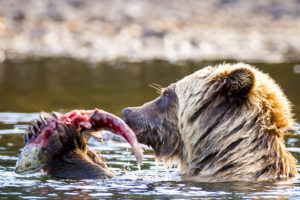 Circumstances were much different the following year. With the salmon run being critically low, grizzlies were not only eating the entire salmon, but als